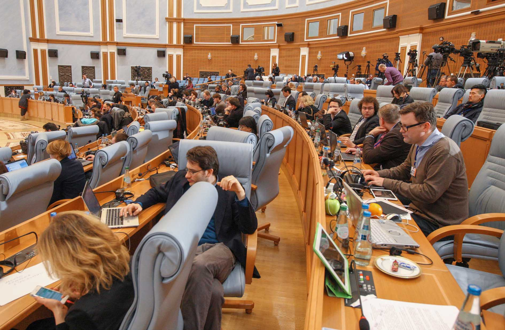 Больш за 500 журналістаў вядучых сусветных СМІ працавалі на сустрэчы кіраўнікоў «нармандскай чацвёркі» ў Мінску. 12 лютага 2015 г.