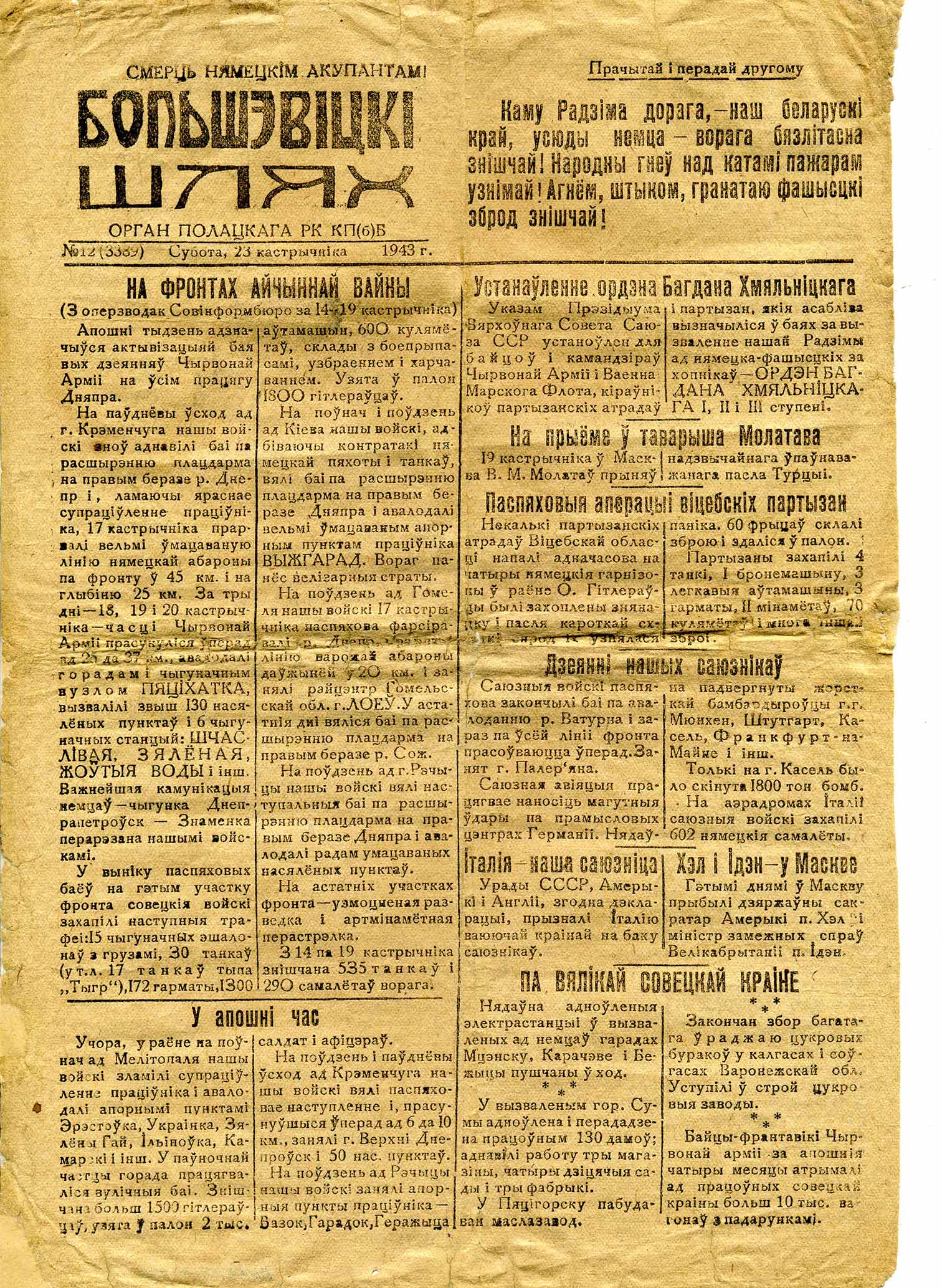 Напярэдадні 26‑й гадавіны Кастрычніцкай рэвалюцыі 1917 г. да выпуску рыхтаваўся святочны нумар, але выпусціць яго не змаглі, паколькі ў партызанскі раён уварваліся нямецкія войскі. Разам з партызанамі супрацоўнікі газеты адышлі за лінію фронту. Рэдакцыя газеты аднавіла сваю работу ў снежні 1943 г. на вызваленай Чырвонай арміяй тэрыторыі Полацкага раёна. У студзені — маі 1944 г. выйшла 19 нумароў, рэдактарам якіх быў П. А. Шадзеўскі.