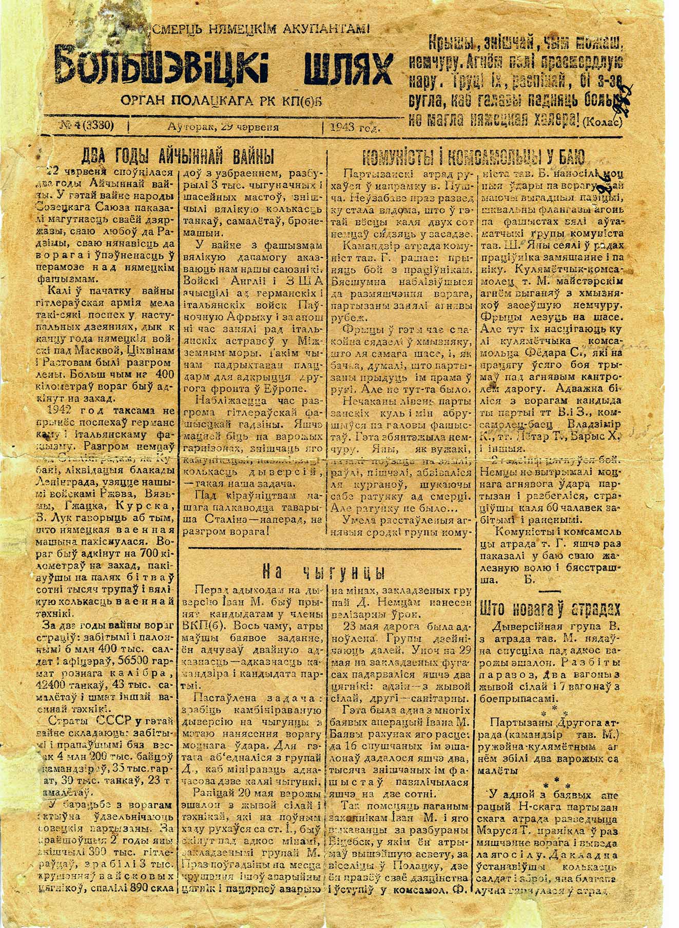 У час Вялікай Айчыннай вайны з’яўлялася органам Полацкага падпольнага райкама КП(б)Б. З чэрвеня па кастрычнік 1943 г. падпольна выйшла 12 нумароў газеты. Вядома 6 нумароў на беларускай мове: № 1 за 2 чэрвеня, № 4 за 29 чэрвеня, № 8 за 3 верасня, № 9 за 11 верасня, № 10 за 26 верасня, № 12 за 23 кастрычніка. Рэдактар Ф. Т. Шэдаў, намеснік рэдактара П. А. Шадзеўскі.