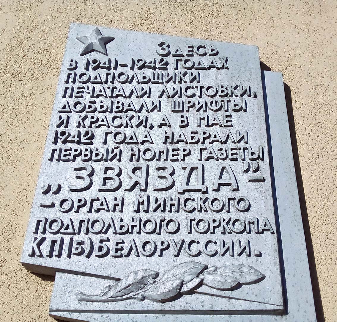 Мемарыяльная дошка на будынку Дома друку ў Мінску, дзе падпольшчыкі ў маі 1942 г. у час Вялікай Айчыннай вайны набралі першы нумар падпольнай газеты «Звязда» — органа Мінскага падпольнага гаркама КП(б)Б.