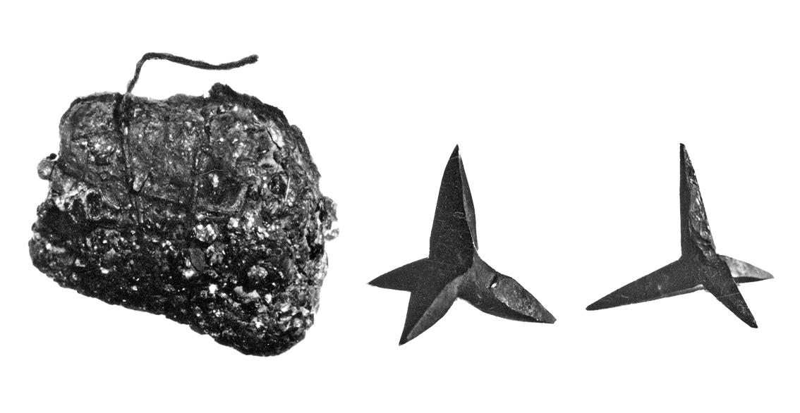 Вугальная міна і вынайдзеныя падпольшчыкамі «чатырохножкі», якія прымяняліся падчас дыверсій на чыгуначнай станцыі Орша Віцебскай вобласці і шашэйных дарогах. 1941–1943 гг.