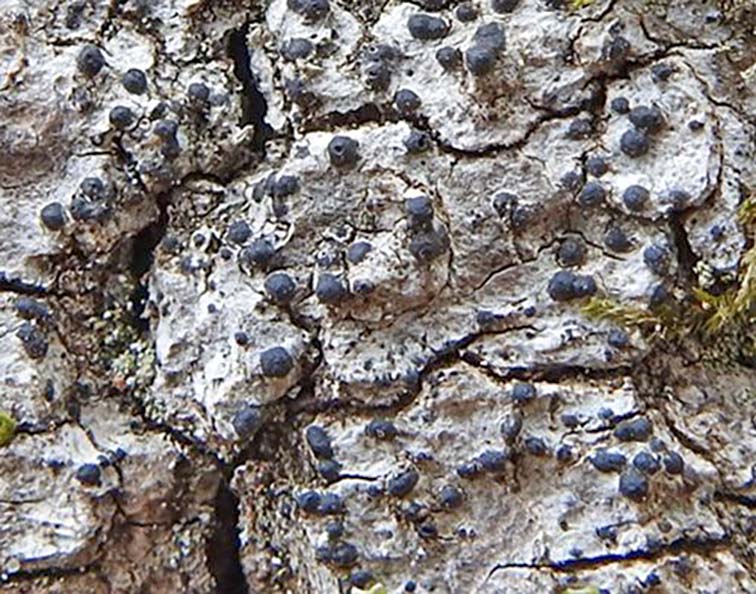 Талом тонкі, гладкі, белы або шаравата-белы. Перытэцыі шматлікія, большай часткай скучаныя, часта зліваюцца па 2–3 штукі, паглыбленыя ў талом толькі асновай, напаўшарападобныя або няправільнай формы, выпуклыя, чорныя, матавыя, даволі буйныя, 0,5–1 мм у дыяметры, з маленькай, не заўсёды прыкметнай вывадной адтулінкай, размешчанай на верхавінцы перытэцыю або збоку. Інвалюкрэлюм (пакрывальца) палавінчаты, каля 60–70 мкм таўшчынёй, бура-чорны. Гіпатэцый ад светла-бурага да бясколернага. Парафізы шматлікія, значна даўжэйшыя за сумкі, разгалінаваныя. Сумкі цыліндрычныя, 120–200 × 12–15 мкм. Споры размешчаны ў адзін рад, шырокаавальныя, з закругленымі канцамі, таўстасценныя, 15–28 × 8–12 мкм.