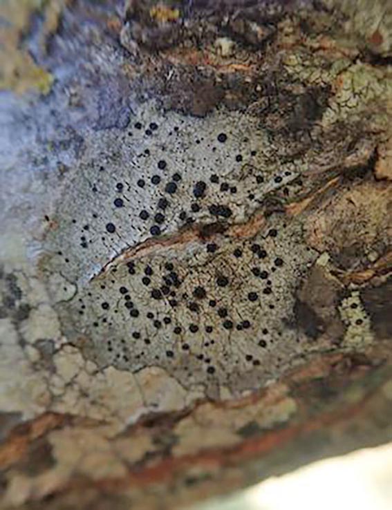 Талом накіпны, ад вельмі тонкай да тоўстай, зярністай, патрэскана-арэаляванай корачкі, ад карычневага да шэрага колеру. Фотабіёнт — аднаклетачная зялёная водарасць роду трэбуксія (Trebouxia Pyum). Апатэцыі чорныя, лецыдзеевага тыпу, звычайна з захаваным краем, ад паглыбленых да сядзячых, цалкам прыціснутых або злёгку звужаных каля асновы. Уласны край апатэцыю (эксцыпул) утвораны радыяльна разбежнымі гіфамі, звычайна афарбаванымі ў верхняй частцы. Эпігіменій ад карычневага да зялёнага. Гіменій без кропляў алею. Гіпатэцый цёмна-карычневы, радзей светлы. Парафізы разгалінаваныя або простыя, канцы парафіз пашыраныя і афарбаваныя. У сумцы па 8 спор. Споры карычневыя 2‑клетачныя, прамыя або крыху выгнутыя. Канідыі вельмі тонкія, доўгія і дугападобныя, 15–30 мкм даўжынёй.