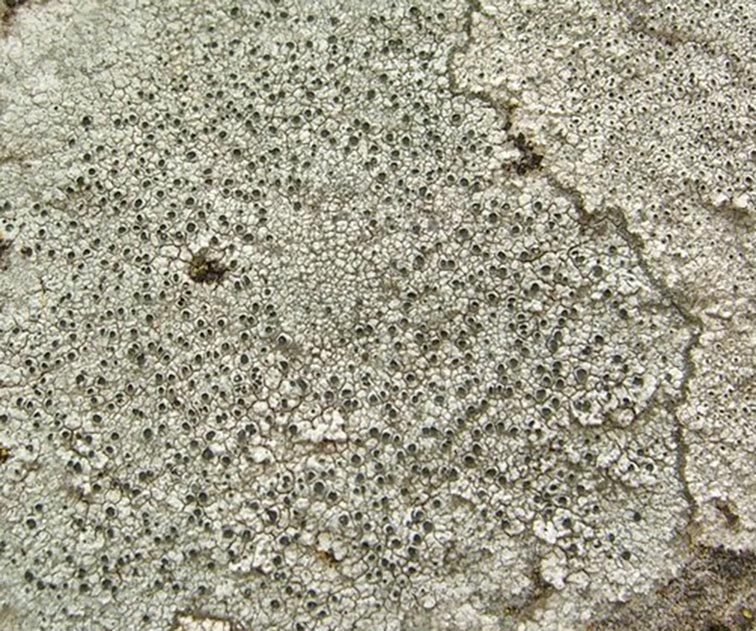 Талом арэалявана-патрэсканы, попельна-шэры, даволі тоўсты. Арэолы вельмі розныя па памеры і форме, шырыня 0,5–1 мм, таўшчыня 0,3–0,6 мм, плоскія, злёгку выпуклыя. Падслаявіна чорная. Апатэцыі леканоравага тыпу размяшчаюцца на бародаўкападобных арэолах, шматлікія, 0,5–1 мм у дыяметры. Уласны край апатэцыю (эксцыпул) каля паверхні аліўкава-карычневы. Гіпатэцый распазнаецца дрэнна. Гіменій з карычнявата-жоўтым адценнем. Эпітэцый карычневы. Парафізы 1,7–2 мкм таўшчынёй, пацеркападобныя. Сумкі булавападобныя, з 8 спорамі. Споры 14–20 × 8–10 мкм.