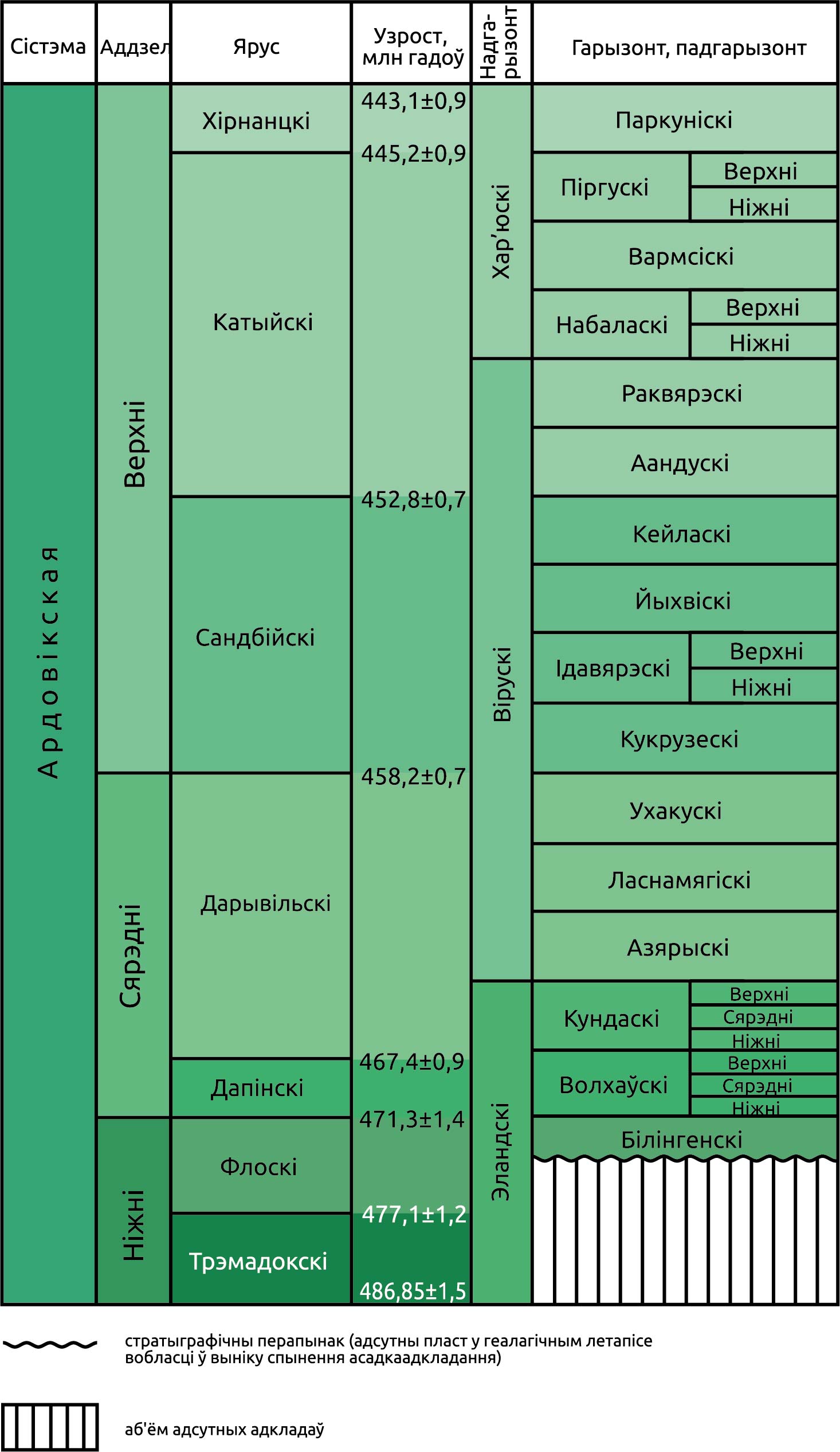 У яе складзе вылучаны 3 аддзелы (эпохі): ніжні (ранняя), сярэдні (сярэдняя) і верхні (позняя). Ніжняму аддзелу адпавядае амаль увесь флоскі ярус (адклады трэмадокскага яруса і самай ніжняй часткі флоскага яруса на тэрыторыі Беларусі адсутнічаюць); сярэдні аддзел уключае дапінскі і дарывільскі ярусы; верхні — сандбійскі, катыйскі і хірнанцкі ярусы. Нароўні з міжнароднымі (агульнымі) стратыграфічнымі падраздзяленнямі вылучаны рэгіянальныя — надгарызонты, гарызонты і падгарызонты; гл. табліцу. Гарызонты вылучаны згодна з біястратыграфічнымі зонамі па мікра- і макрафаўне. Флоскі ярус уключае білінгенскі гарызонт; дапінскі — большую частку волхаўскага гарызонту; дарывільскі — верх волхаўскага гарызонту, азярыскі, ласнамягіскі і ўхакускі гарызонты; сандбійскі — кукрузескі, ідавярэскі, йыхвіскі і кейласкі гарызонты; катыйскі — аандускі, раквярэскі, набаласкі, вармсіскі і піргускі гарызонты; хірнанцкі — паркуніскі гарызонт (гл. табліцу). У стратыграфічнай схеме ардовікскіх адкладаў прадстаўлена таксама мясцовая стратыграфічная шкала ў аб’ёме серый геалагічных і світ геалагічных, якія супастаўляюцца з рэгіянальнымі гарызонтамі заходняй часткі Усходне-Еўрапейскай платформы.
