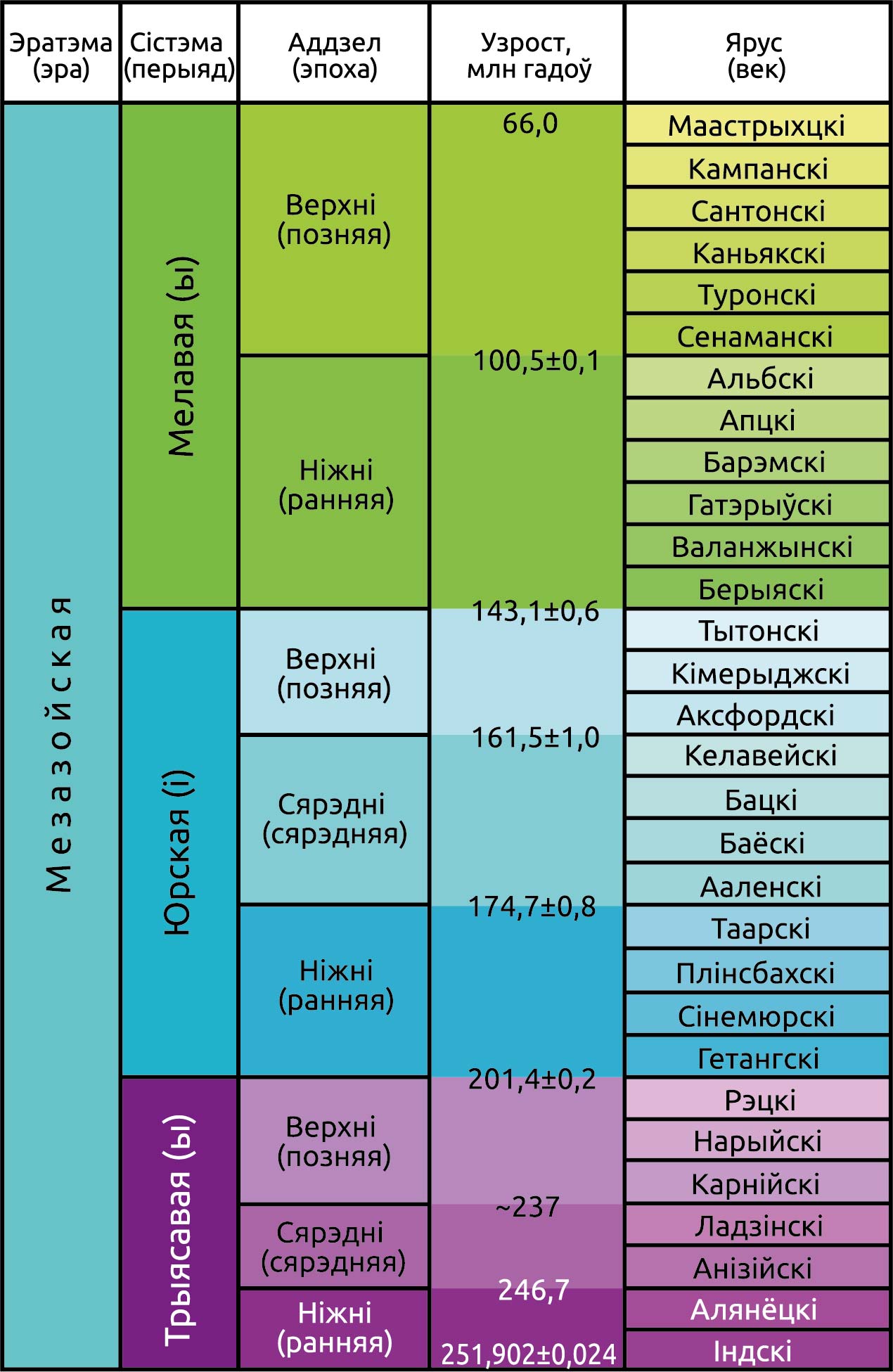 Згодна з Міжнароднай хронастратыграфічнай шкалой (2024), мезазойская эра цягнулася каля 186 млн гадоў (пачалася 251,902 ± 0,024 млн гадоў таму, скончылася 66 млн гадоў таму); гл. табліцу.