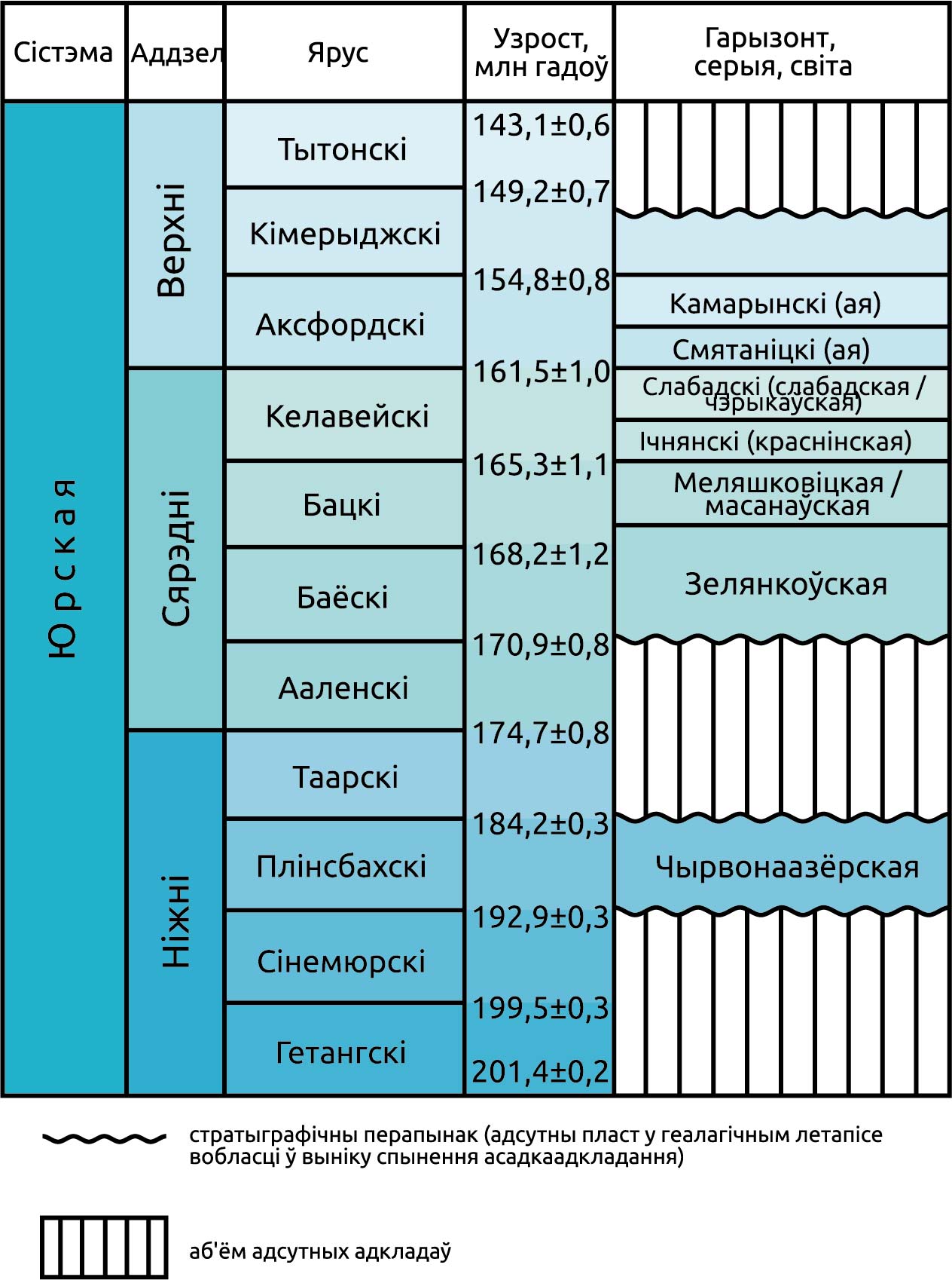 На тэрыторыі Беларусі ў складзе юрскай сістэмы вылучаны 3 аддзелы (ніжні, сярэдні, верхні) і 6 ярусаў (плінсбахскі, баёскі, бацкі, келавейскі, аксфордскі і кімерыджскі).