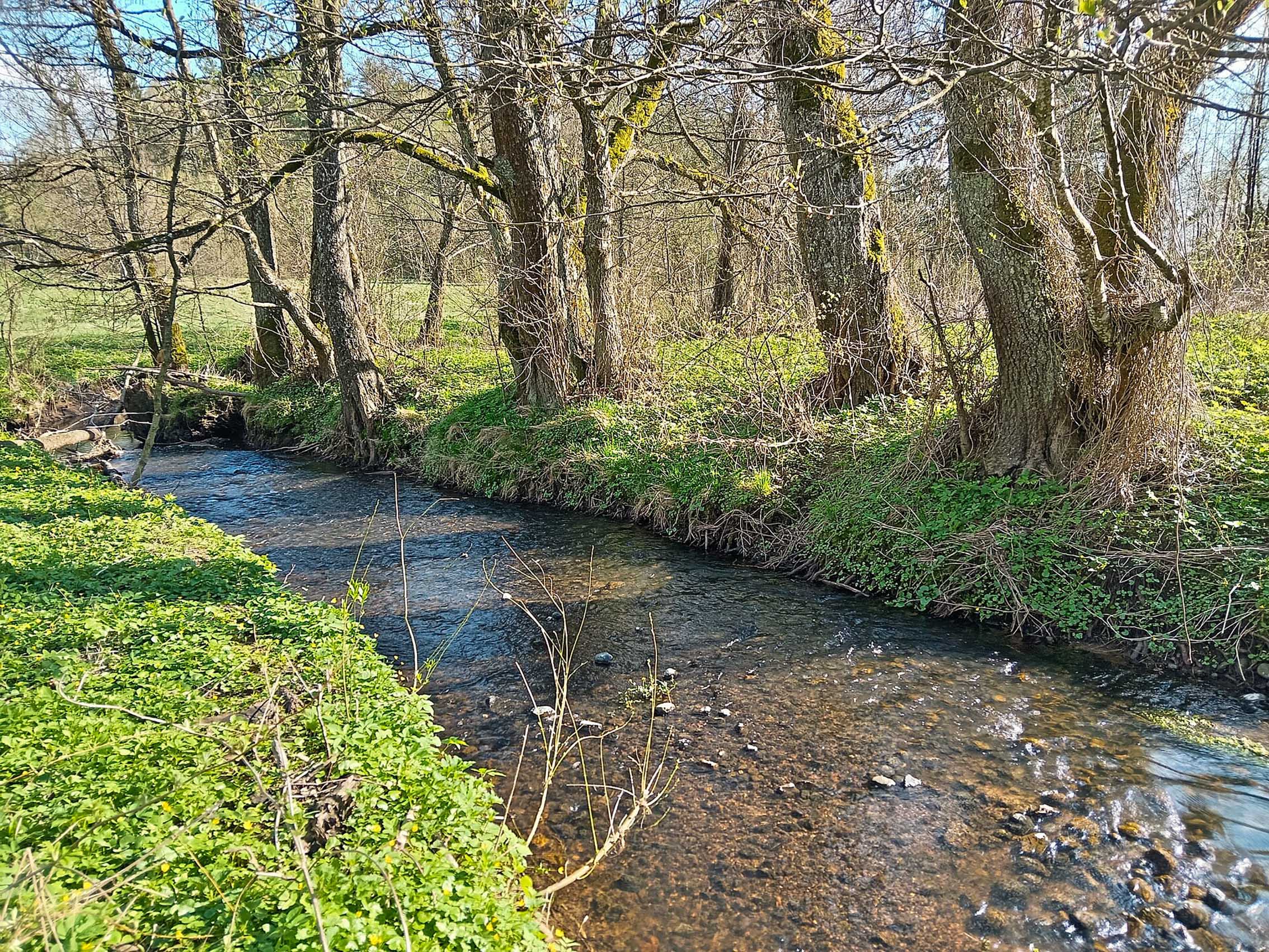 Пойма роўная, месцамі забалочаная, пакрытая хмызняком (шырыня 100–150 м).